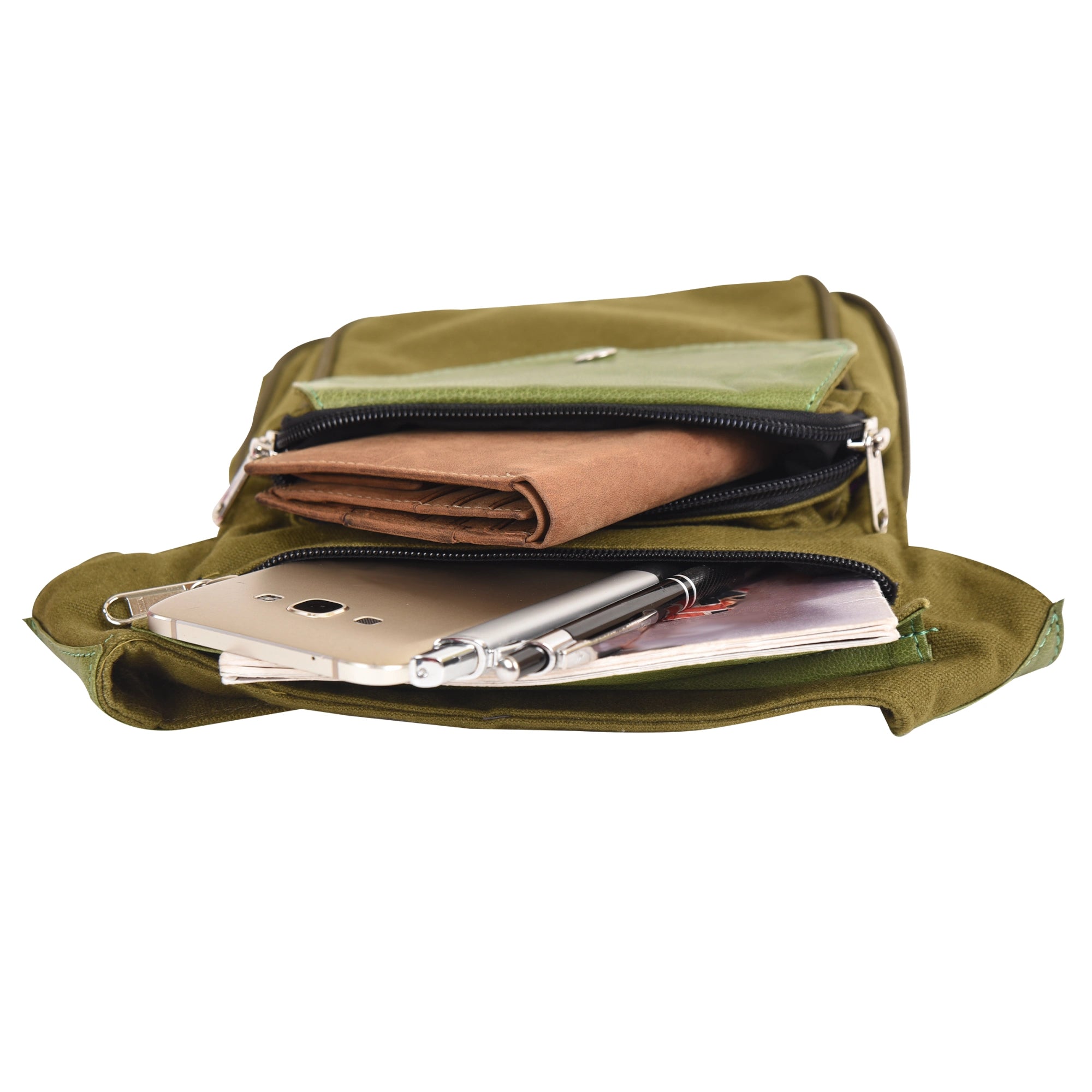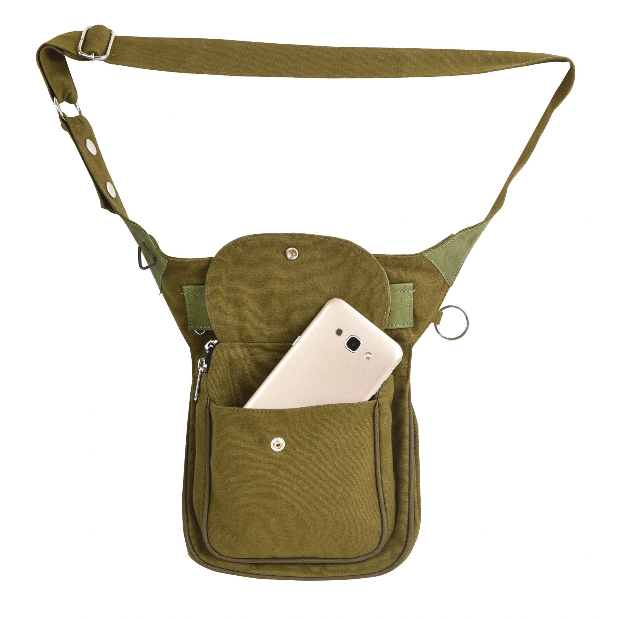 Neben einem weiteren Reißverschlussfach auf der Rückseite findest Du auf der vorderen Seite ein mit Druckknopf verschließbares Einsteckfach, das sich gut für Dein Handy eignet.