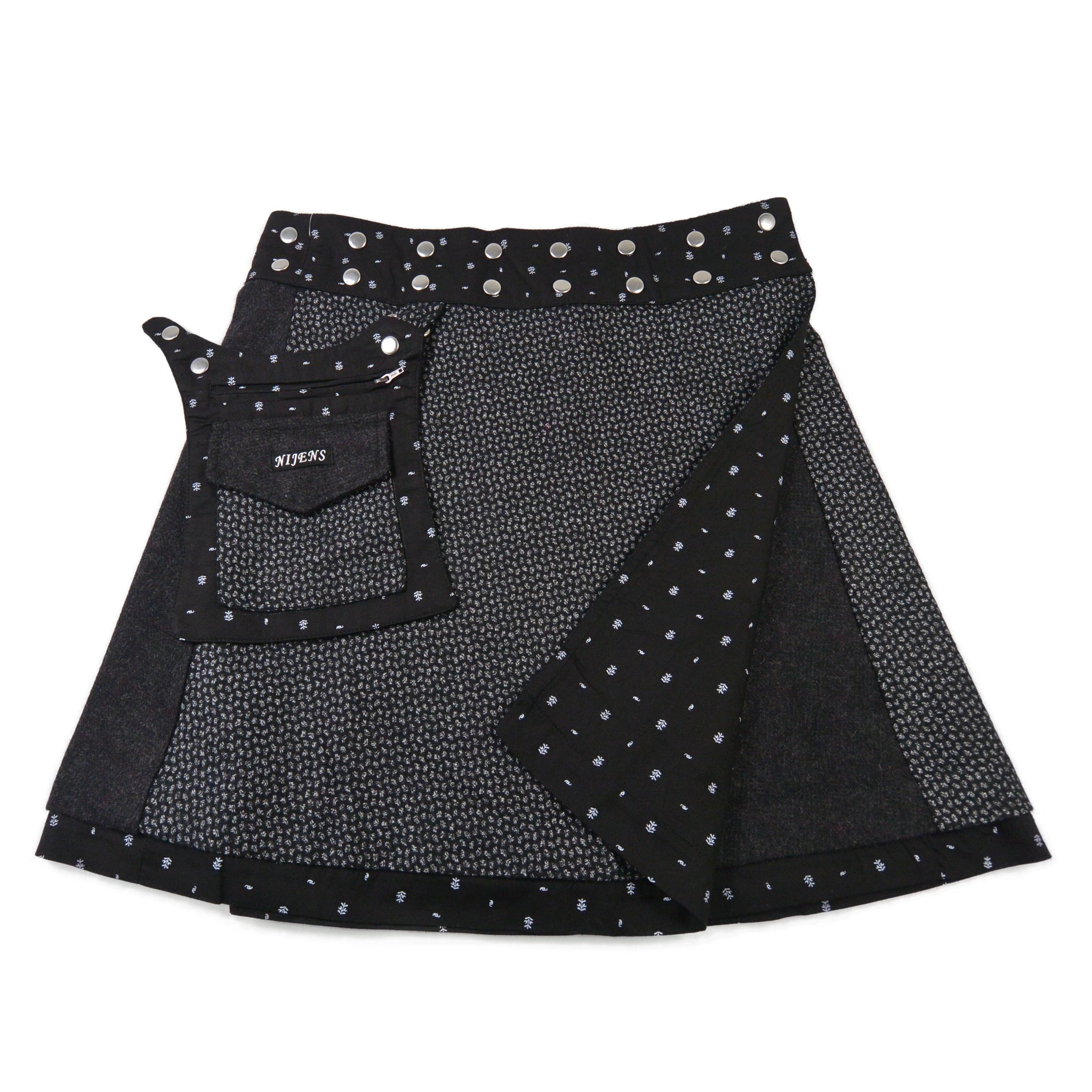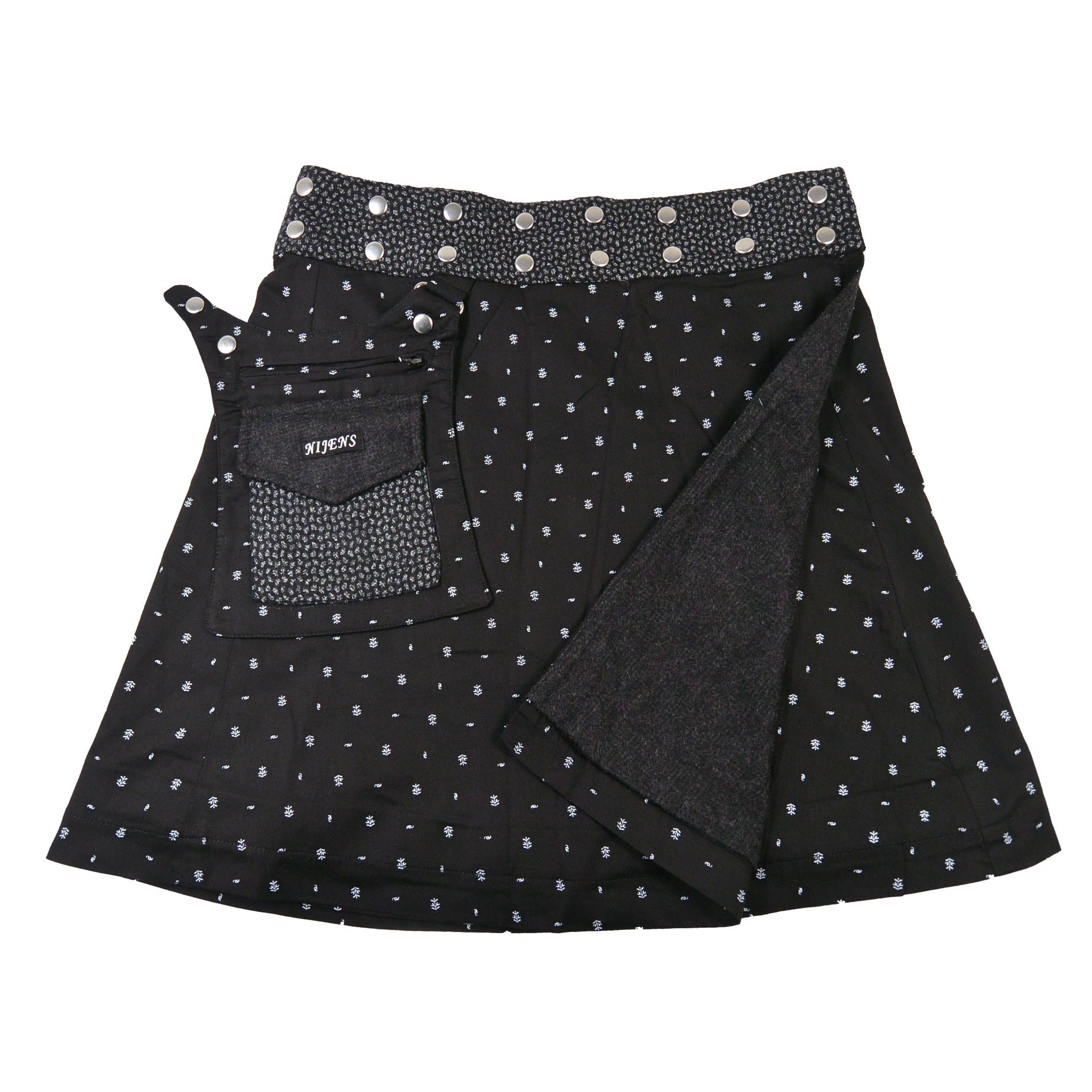 Mit einer doppelten Druckknopfleiste lässt sich der Umfang schnell und bequem einstellen. Eine abnehmbare Tasche macht diesen praktischen Wenderock zu einem funktionalen Blickfang.